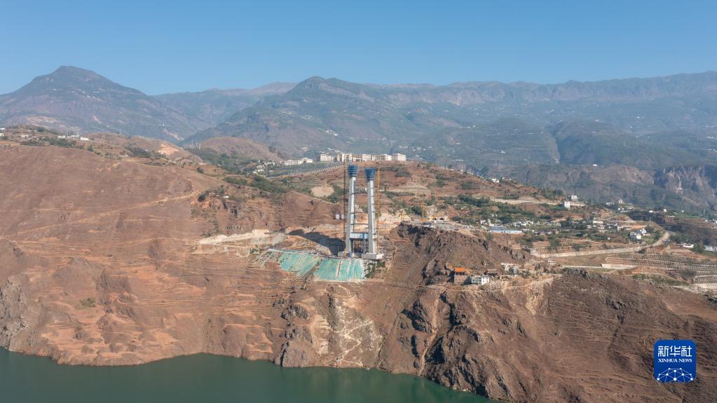 這是11月24日拍攝的川滇金沙江特大橋云南岸施工現場(chǎng)(無(wú)人機照片)。