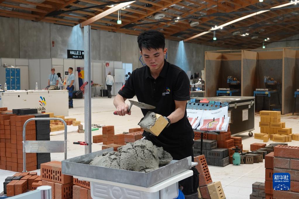 11月24日,來(lái)自中建五局高級技工學(xué)校的伍遠州在奧地利薩爾茨堡參加2022年世界技能大賽特別賽奧地利賽區砌筑項目比賽。