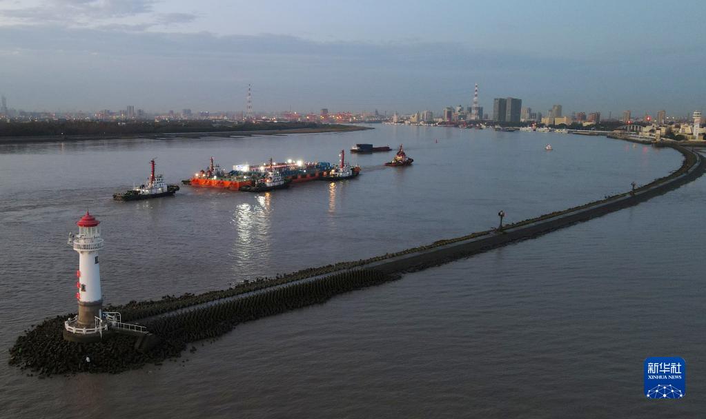 11月25日,裝載著(zhù)長(cháng)江口二號古船的“奮力”輪,在拖船牽引下航行在吳淞口水域。