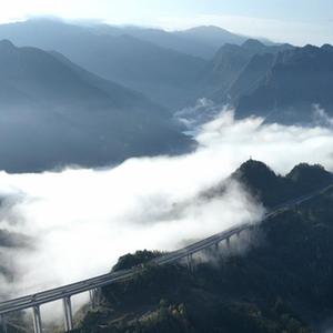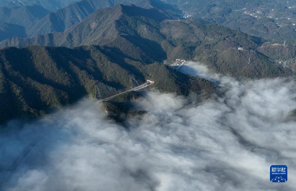 當日,湖北宣(恩)鶴(峰)高速公路在云霧中若隱若現,美如畫(huà)卷。