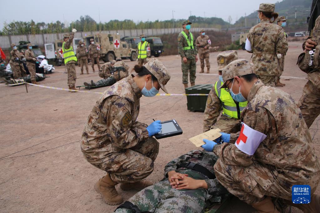 11月20日,在“衛勤力量-2022A1”基地化訓練中,野戰醫院分類(lèi)處置組對批量“傷員”進(jìn)行檢傷分類(lèi)。新華社發(fā)(張怡涵 攝)