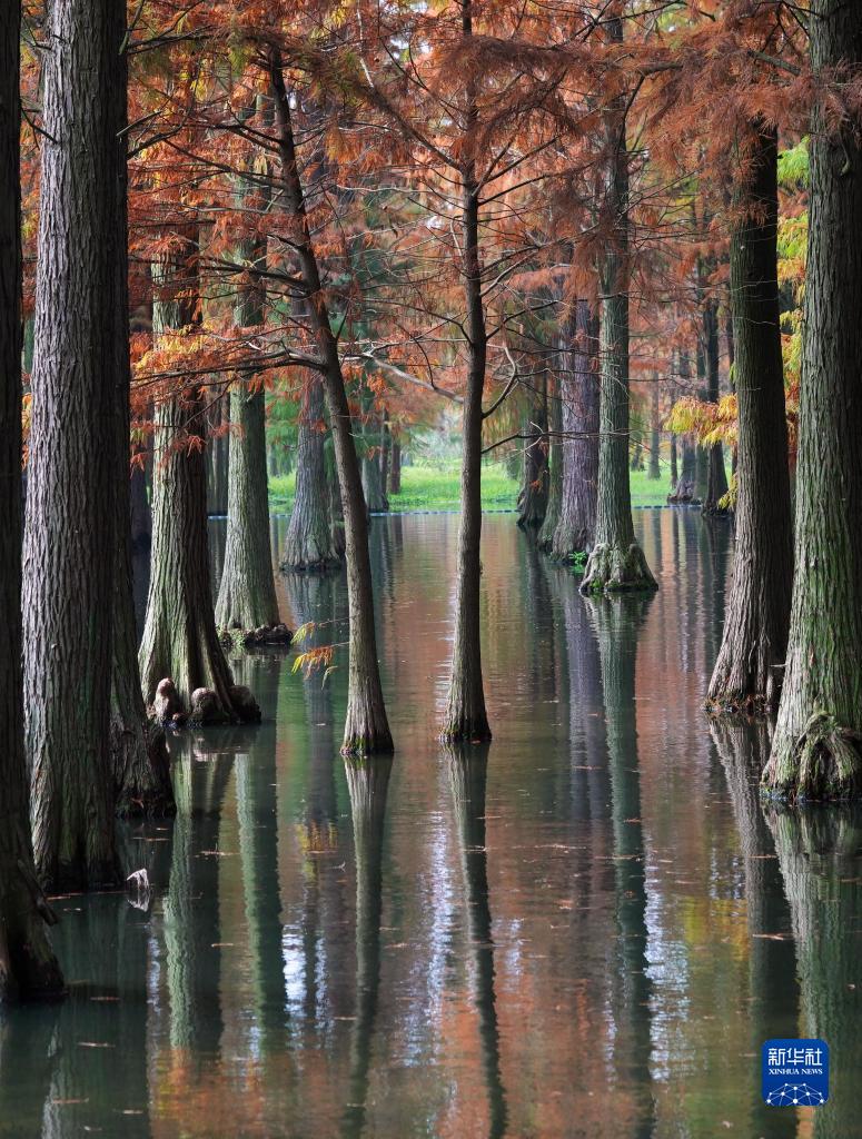 近日,上海青西郊野公園“水上森林”的水杉、池杉、落羽杉等枝頭盡染,風(fēng)景如畫(huà)。