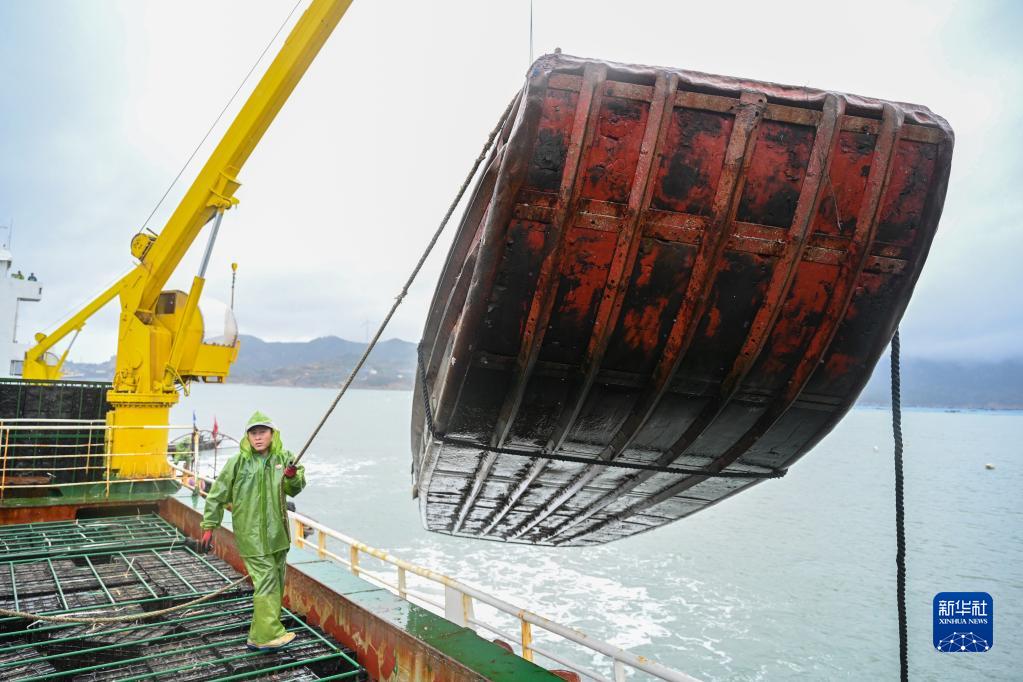 11月25日,在福州連江縣苔菉鎮后灣海域,漁民用運輸船上的吊機吊起漁船準備裝貨。