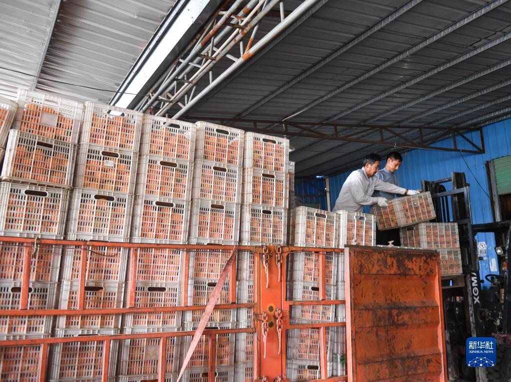 11月26日,在信豐縣安西鎮一家臍橙專(zhuān)業(yè)合作社,果農將臍橙裝車(chē)。