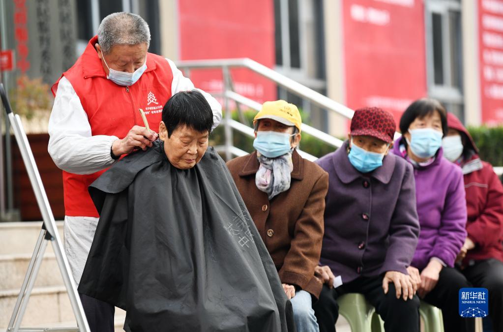 11月17日,在西安市雁塔區電子城街道二〇五所社區,志愿者梁厚喜(上)為社區老年居民理發(fā)。