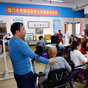 在廈門(mén)中途之家脊髓損傷者服務(wù)中心,謝啟明(左一)與“輪椅跑友”交流心得(11月26日攝)。