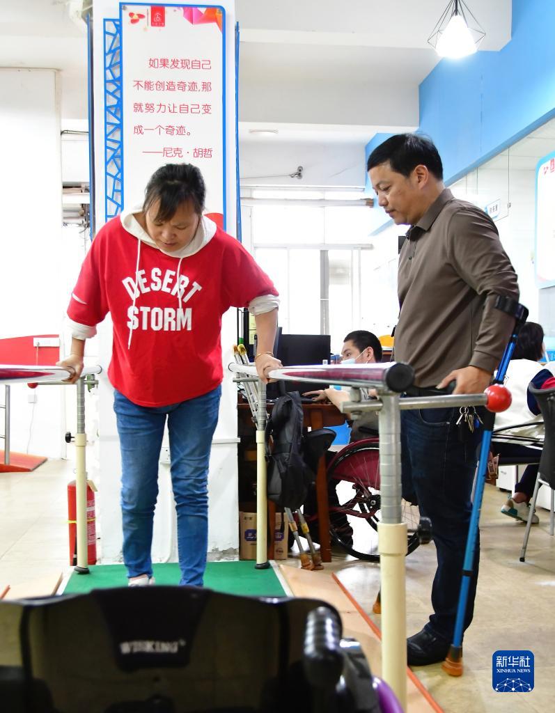 謝啟明(右一)在給一名殘疾人進(jìn)行行走輔導(11月25日攝)。新華社記者 魏培全 攝