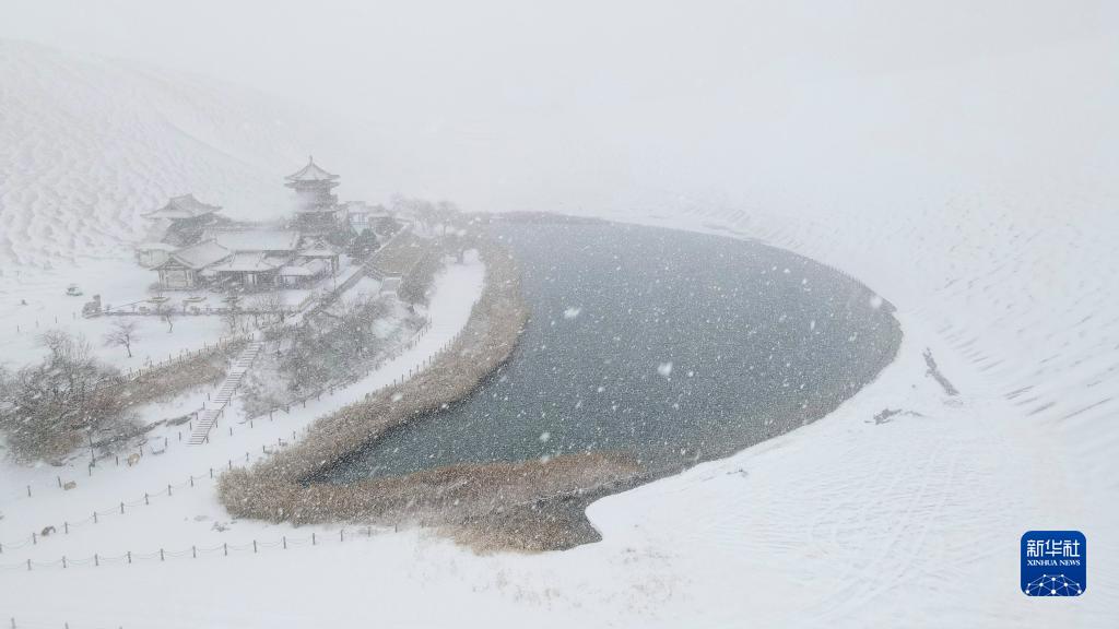 當日,甘肅敦煌迎來(lái)降雪。當地著(zhù)名景點(diǎn)鳴沙山月牙泉銀裝素裹、分外迷人。