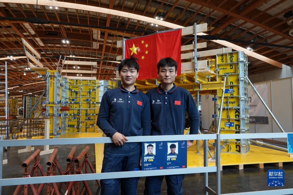 11月26日,在奧地利薩爾茨堡,來(lái)自鄭州商業(yè)技師學(xué)院的張陽(yáng)光(右)和劉錦豪在完成混凝土建筑項目比賽后與作品合影。二人合力摘得該項目銅牌。