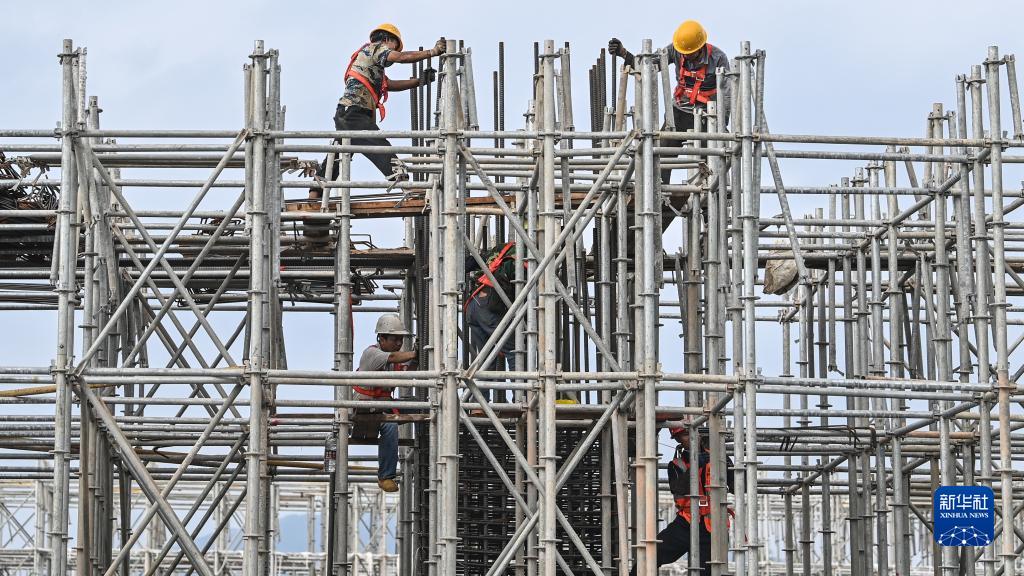 在玉林北站工地,工人在搭建站房鋼筋架(11月27日攝)。