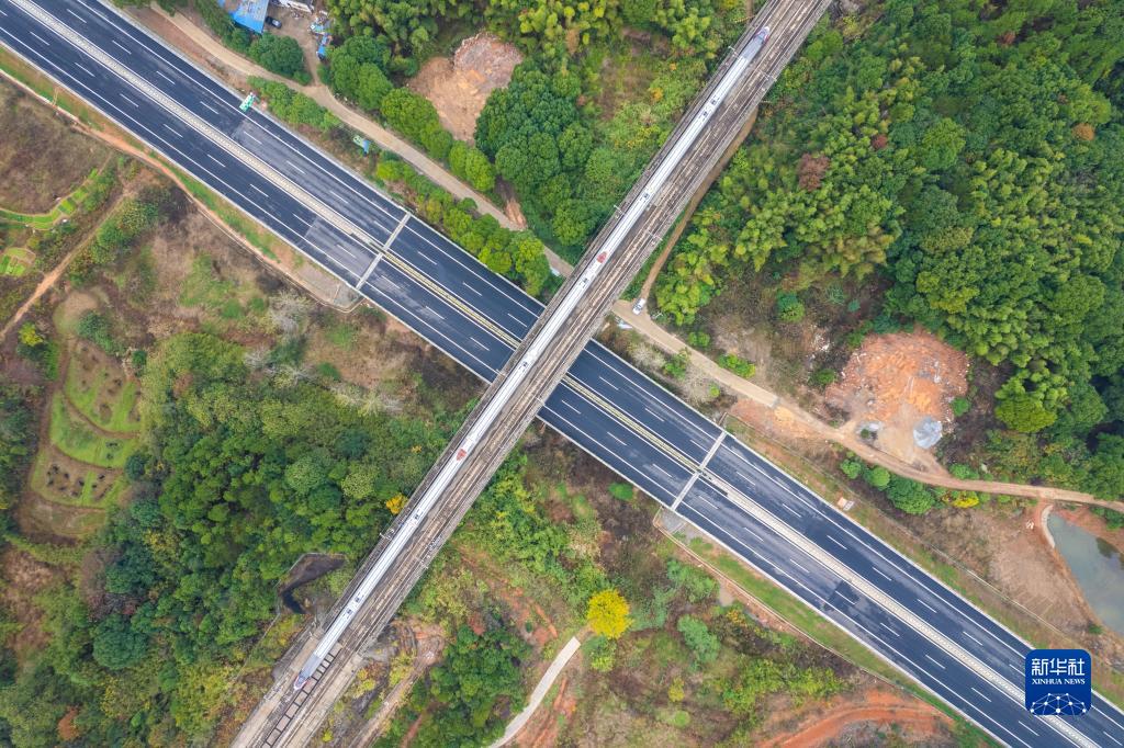 11月28日,高鐵列車(chē)從湖南平益高速上方駛過(guò)(無(wú)人機照片)。