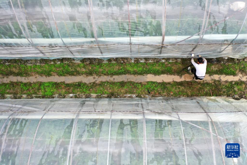 11月28日,農戶(hù)在浙江省樂(lè )清市石帆街道大林村西紅柿種植基地加固大棚,做好抵御寒潮的準備工作(無(wú)人機照片)。