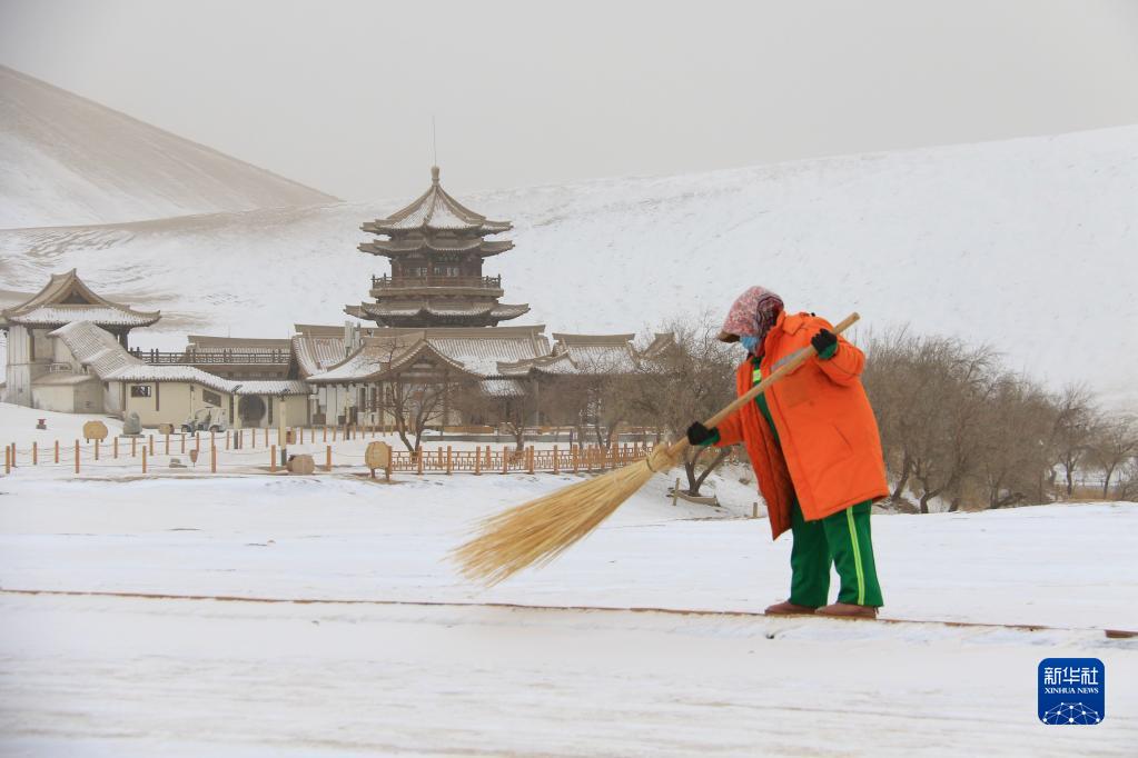 11月28日,保潔人員在甘肅省敦煌市鳴沙山月牙泉景區清理積雪。