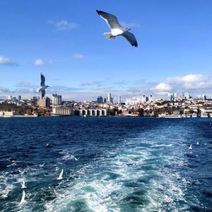 11月27日,海鷗在土耳其博斯普魯斯海峽的水面上覓食。