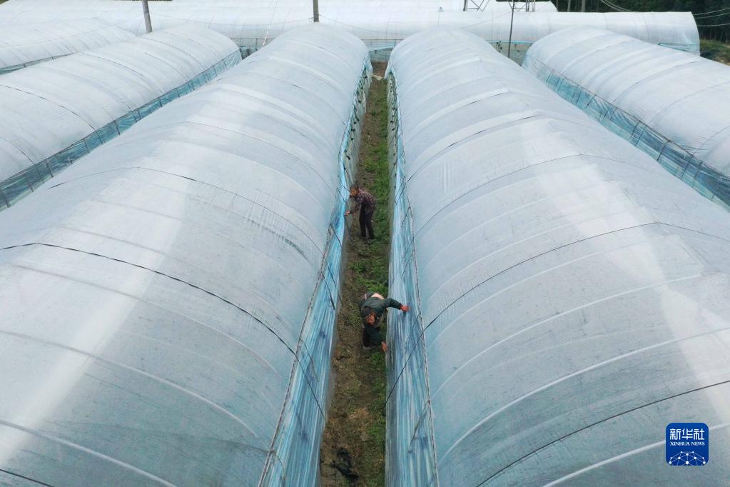 11月29日,在貴州省黔南布依族自治州都勻市勻東鎮大坪村草莓種植基地,農戶(hù)覆蓋大棚保溫膜,做好抵御寒潮的準備工作(無(wú)人機照片)。