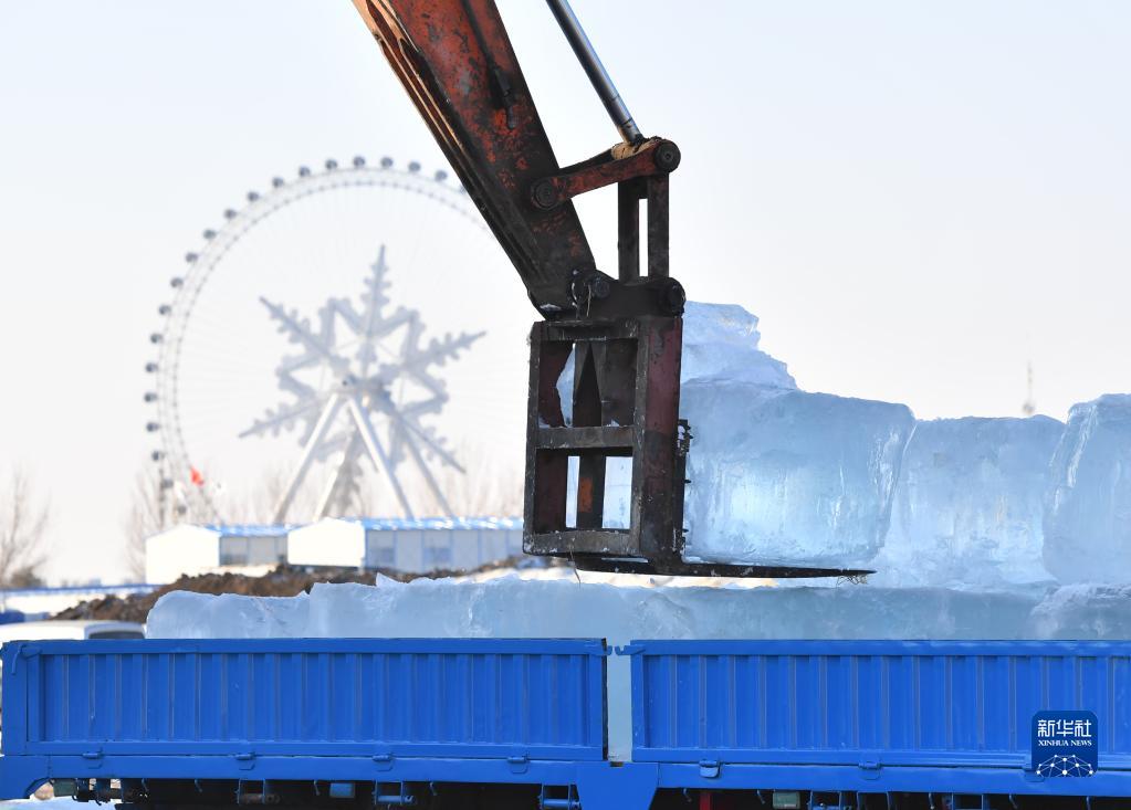 哈爾濱冰雪大世界的工程車(chē)輛在取冰(11月26日攝)。