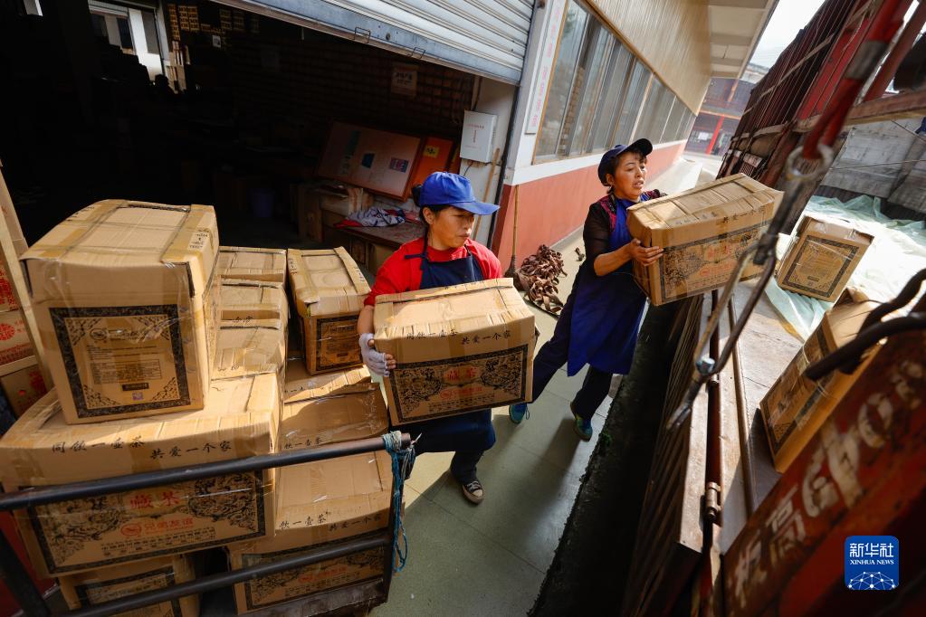 四川省雅安市友誼茶葉有限公司的工人將運往西藏拉薩的“藏茶”產(chǎn)品搬運裝車(chē)(2022年11月24日攝)。