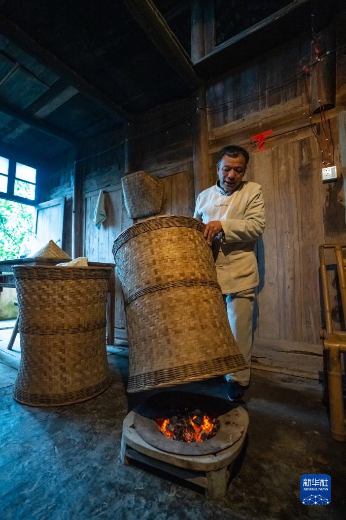 在四川省雅安市名山區的張氏祖屋,張躍華用傳統方式烘焙茶葉(2022年3月31日攝)。蒙山茶產(chǎn)于四川省雅安市名山區境內的蒙頂山,是綠茶的一種。張躍華,生于1959年,是國家級非物質(zhì)文化遺產(chǎn)代表性項目——綠茶制作技藝(蒙山茶傳統制作技藝)的代表性傳承人。張躍華自幼隨父親學(xué)習蒙山茶傳統制作技藝,是“張氏甘露”第五代傳人,他每年都要招收年輕徒弟,希望蒙山茶傳統制作技藝能世世代代傳承下去。