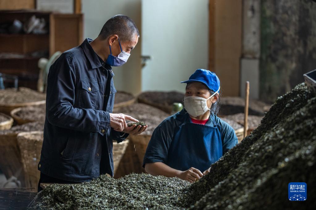 在四川省雅安市友誼茶葉有限公司的生產(chǎn)車(chē)間,甘玉祥(左)指導工人檢查茶的品質(zhì)(2022年11月24日攝)。南路邊茶是黑茶的一種,產(chǎn)于四川省雅安市,又稱(chēng)“邊銷(xiāo)茶”“南邊茶”“藏茶”等。甘玉祥,生于1963年,是國家級非物質(zhì)文化遺產(chǎn)代表性項目——黑茶制作技藝(南路邊茶制作技藝)的代表性傳承人。他從小隨父親學(xué)習制作南路邊茶,希望通過(guò)不懈努力,讓南路邊茶被更多人飲用和喜愛(ài)。