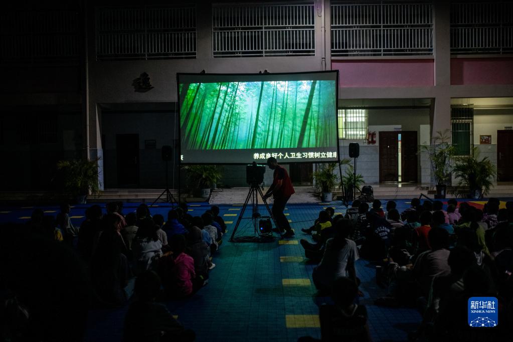 在怒江州瀘水市,楊明金給特殊教育學(xué)校的孩子放電影(2022年10月22日攝)。