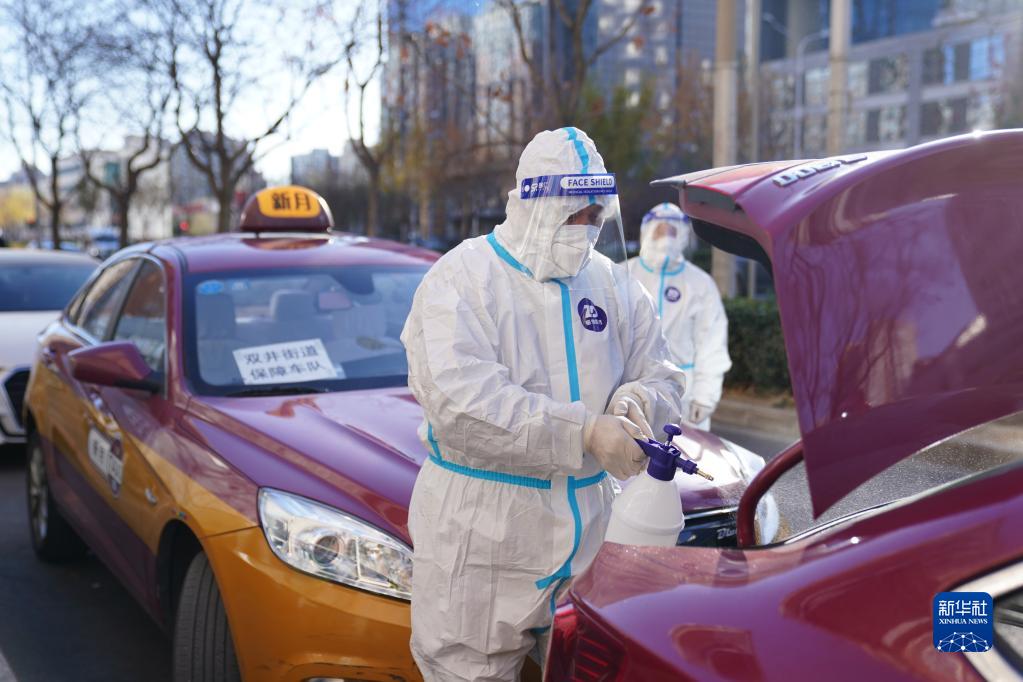 在北京市朝陽(yáng)區雙井街道九龍山社區,駕駛員彭輝(前)在出車(chē)前對車(chē)輛進(jìn)行消殺(11月30日攝)。