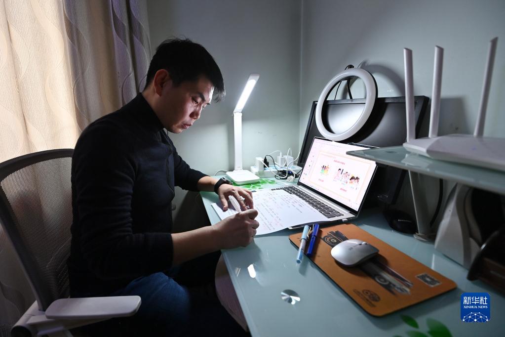 11月30日,太原市交通學(xué)校老師韓銳在家里整理線(xiàn)上心理課程教案。