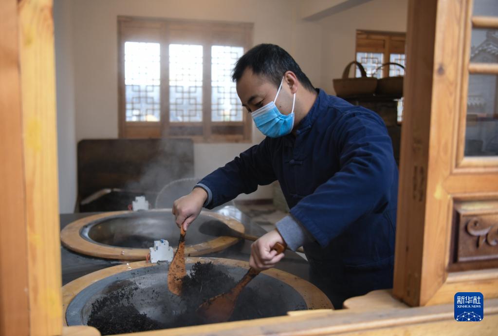 在咸陽(yáng)“益生源記”仿古茯茶作坊,筑茶師王萌樂(lè )展示炒茶工藝(11月30日攝)。