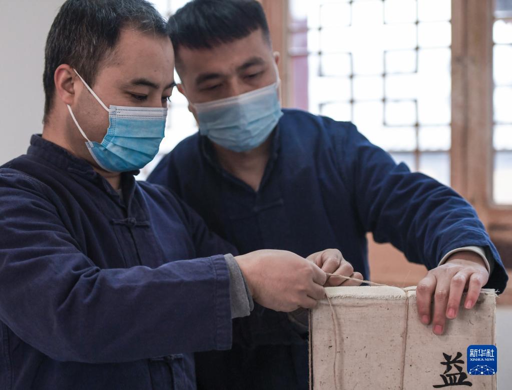 在咸陽(yáng)“益生源記”仿古茯茶作坊,筑茶師王萌樂(lè )(左)、劉林展示捆扎工藝(11月30日攝)。