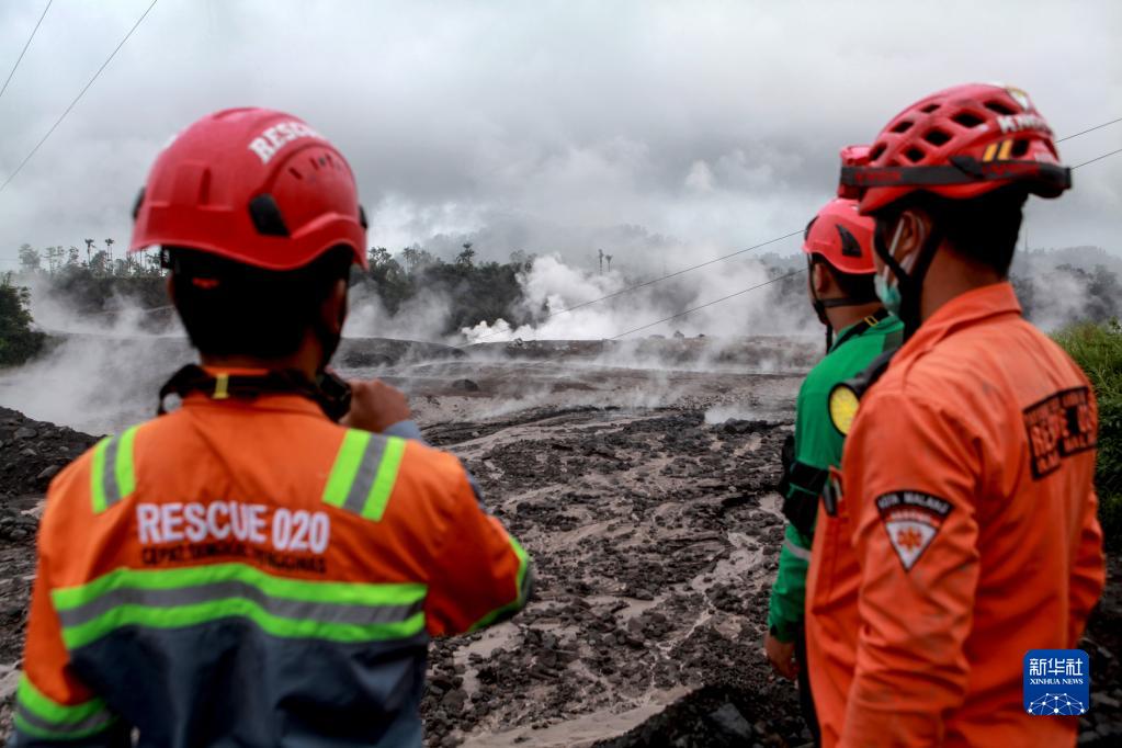 12月4日,在印度尼西亞?wèn)|爪哇省盧馬姜的薩皮圖朗村,救援人員查看塞梅魯火山噴發(fā)后的受影響區域。