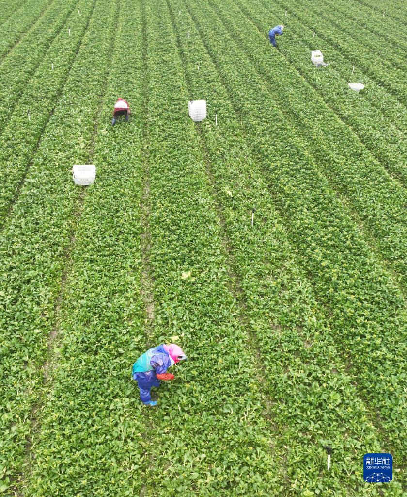 12月4日,在湖南省永州市道縣清塘鎮室家村,村民在蔬菜基地采摘蔬菜(無(wú)人機照片)。