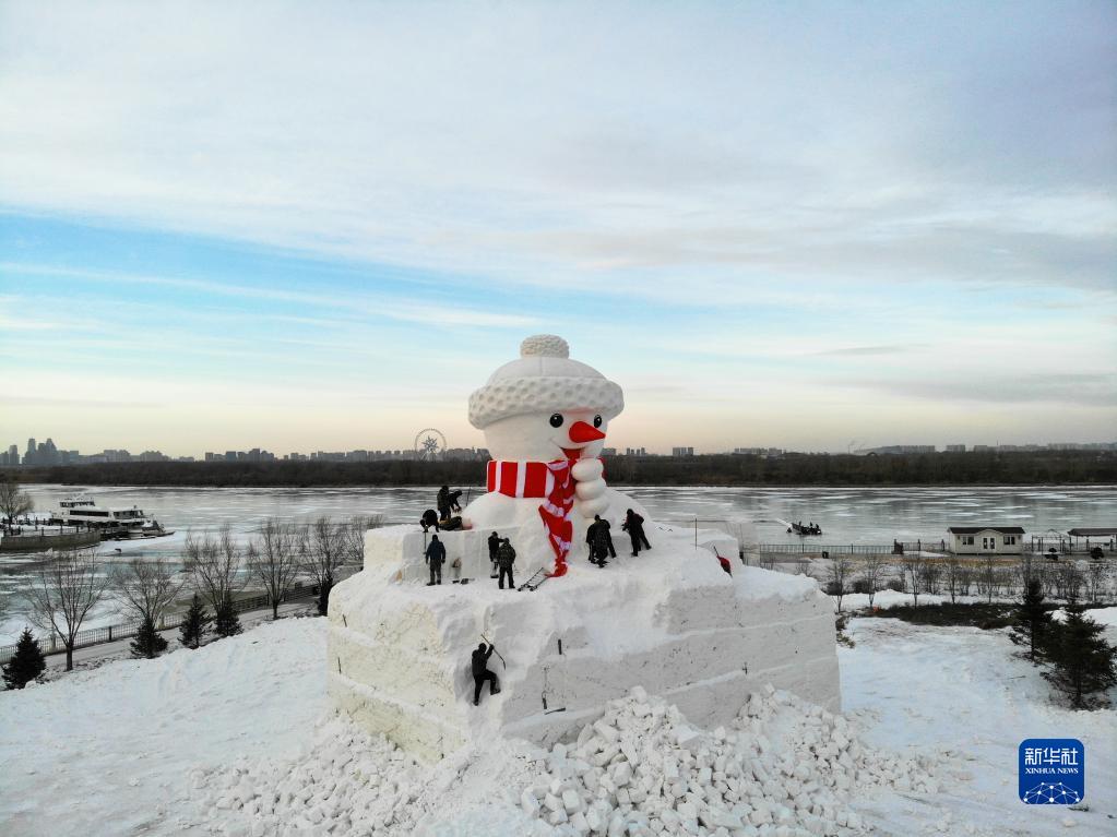 12月6日,工人在松花江哈爾濱段江畔搭建巨型雪人(無(wú)人機照片)。