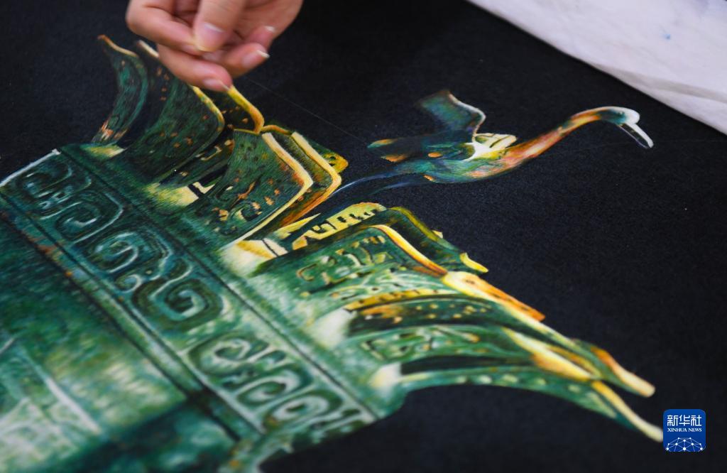 在廣州市荔灣區的工作室,王新元在制作一件以青銅器為主題的廣繡作品(12月6日攝)。