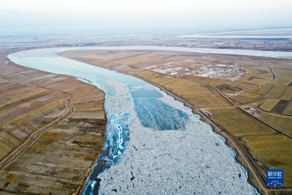 12月7日拍攝的內蒙古鄂爾多斯市達拉特旗冰封黃河景象(無(wú)人機照片)。