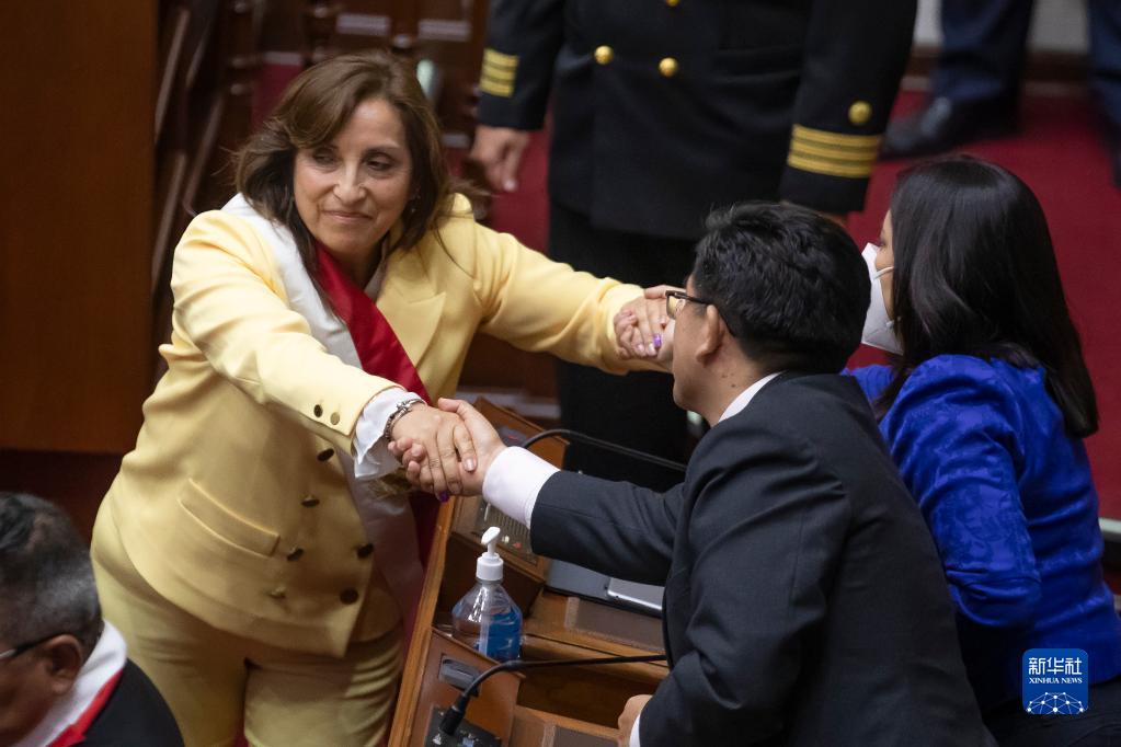 12月7日,在秘魯利馬,迪娜·博盧阿特(左)在國會(huì )宣誓就任總統時(shí)接受祝賀。
