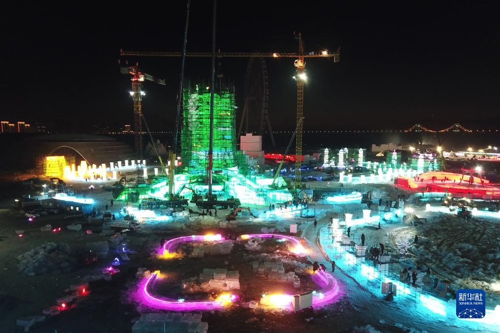 12月7日,施工人員在哈爾濱冰雪大世界園區施工作業(yè)(無(wú)人機照片)。
