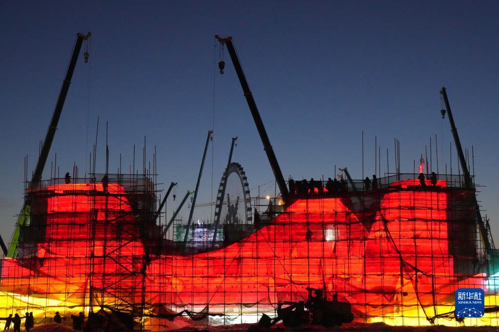 12月7日,施工人員在哈爾濱冰雪大世界園區施工作業(yè)。