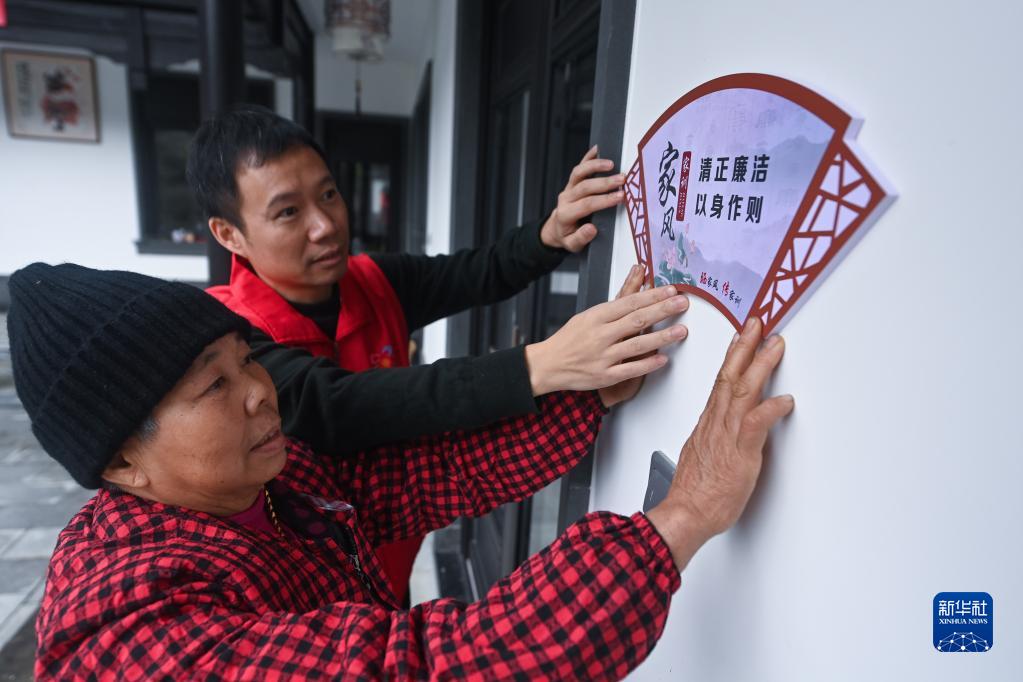 12月9日,在杭州市臨安區太陽(yáng)鎮上莊村,黨員志愿者和村民一起把清廉家風(fēng)的宣傳牌掛在墻上。