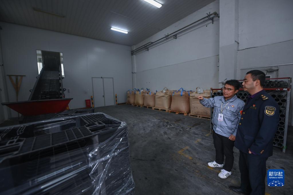12月9日,在位于杭州市臨安區的杭州福斯特應用材料股份有限公司,杭州市生態(tài)環(huán)境局臨安分局的工作人員(右一)了解企業(yè)廢塑料循環(huán)再造的情況。該企業(yè)通過(guò)自主研發(fā),將企業(yè)內部產(chǎn)生的一般塑料固廢和廢塑料桶制作成塑料托盤(pán),降低了固體廢料的排放。新華社記者 徐昱 攝