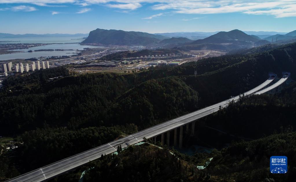 這是12月8日拍攝的新昆楚高速昆明入城段一景,遠處是昆明滇池及西山景區(無(wú)人機照片)。新華社記者 陳欣波 攝