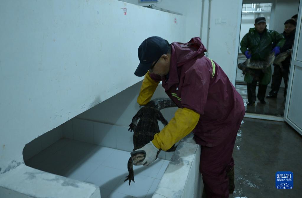 11月30日,在安徽揚子鱷國家級自然保護區夏渡片區,工作人員將人工繁育的揚子鱷放入越冬暖房。