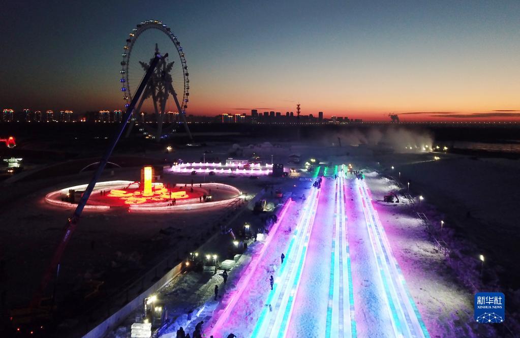 12月8日,工人在哈爾濱冰雪大世界園區施工(無(wú)人機照片)。