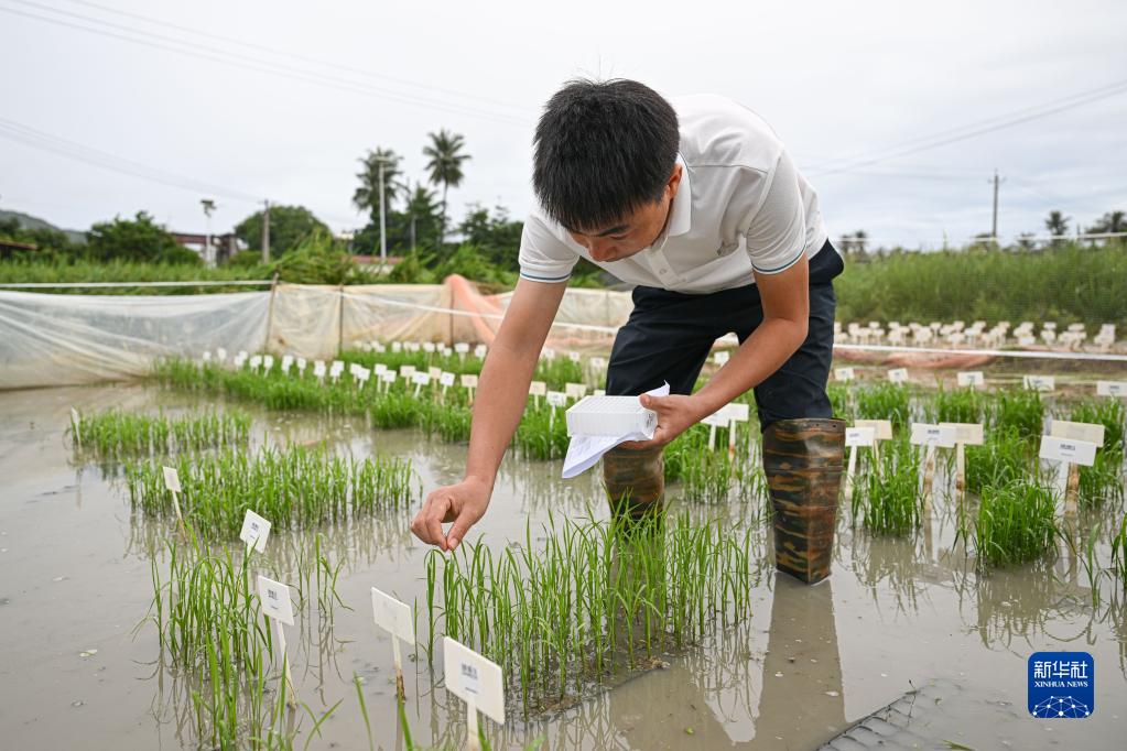在位于海南陵水的國家南繁科研育種核心區安馬洋基地,賀治洲對水稻育種材料進(jìn)行葉片取樣(9月23日攝)。新華社記者 蒲曉旭 攝