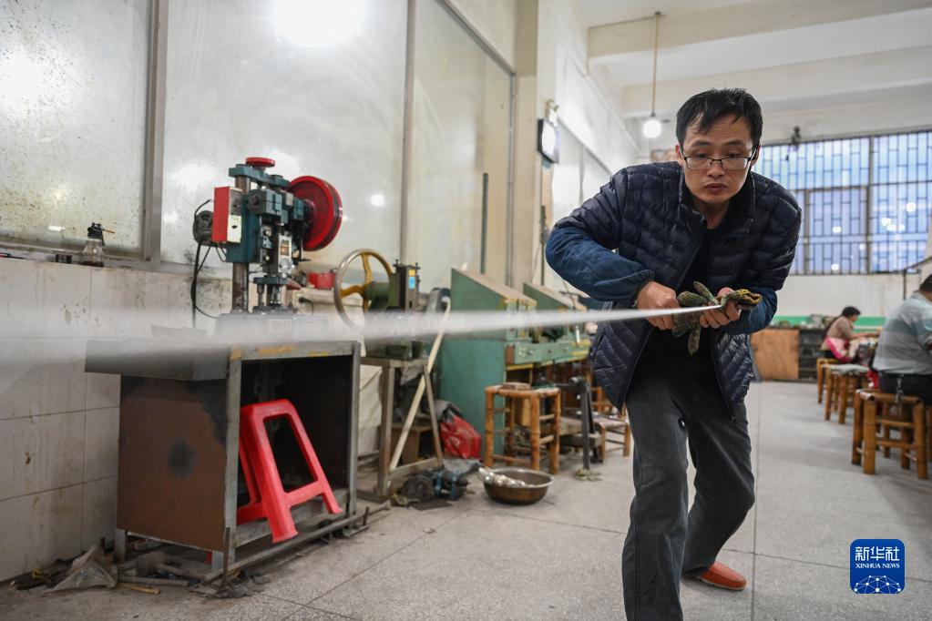 12月8日,工人在上塘村的一家銀飾生產(chǎn)加工企業(yè)的車(chē)間內拉銀。