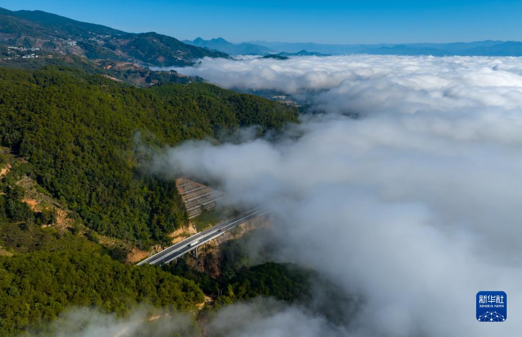 在云南省臨滄市一處公路,汽車(chē)穿行在云海間(12月10日攝,無(wú)人機照片)。