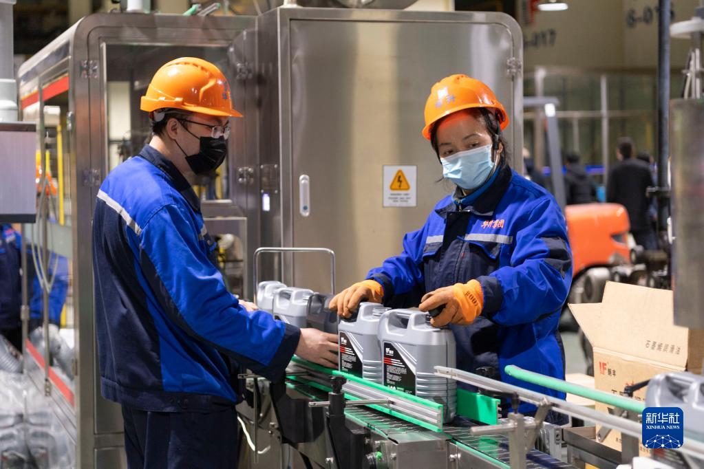 工人在位于鶴崗市的黑龍江省華升石墨集團股份有限公司車(chē)間內進(jìn)行石墨烯潤滑油生產(chǎn)作業(yè)(12月8日攝)。