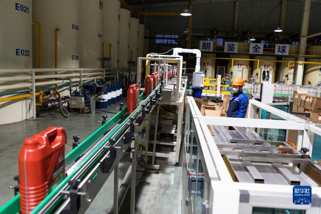 工人在位于鶴崗市的黑龍江省華升石墨集團股份有限公司車(chē)間內進(jìn)行石墨烯潤滑油生產(chǎn)作業(yè)(12月8日攝)。