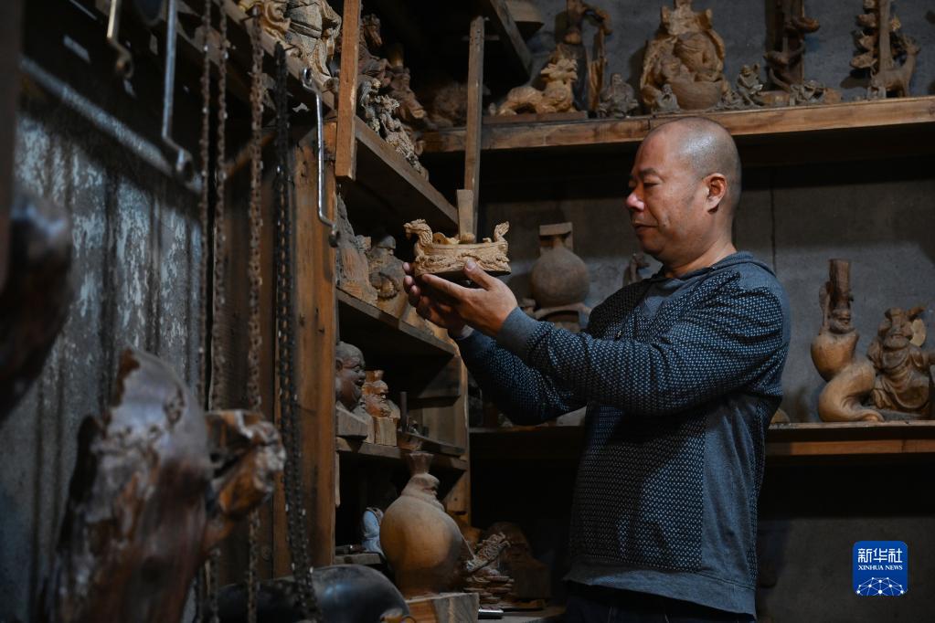 12月9日,陳志華在莆田市秀嶼區根藝博物館內查看根雕成品。