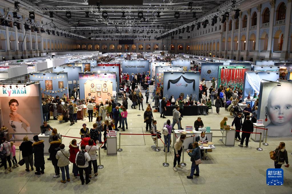 這是12月10日在俄羅斯莫斯科拍攝的玩偶藝術(shù)展現場(chǎng)。