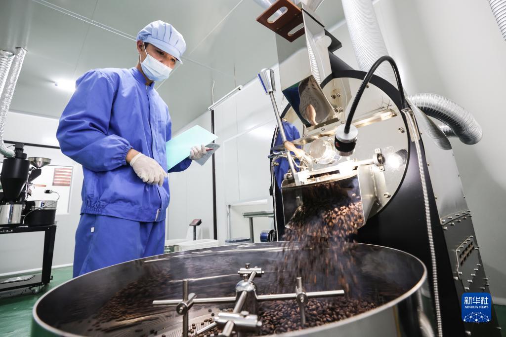 12月10日,在位于海南澄邁的才存咖啡廠(chǎng),返鄉大學(xué)生 、該廠(chǎng)副總經(jīng)理徐寶在烘焙咖啡。