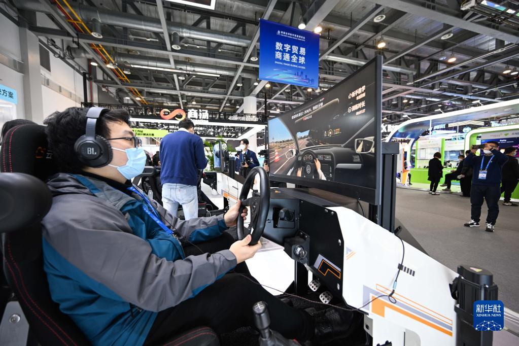 12月12日,工作人員在首屆全球數字貿易博覽會(huì )上展示虛擬駕駛系統。